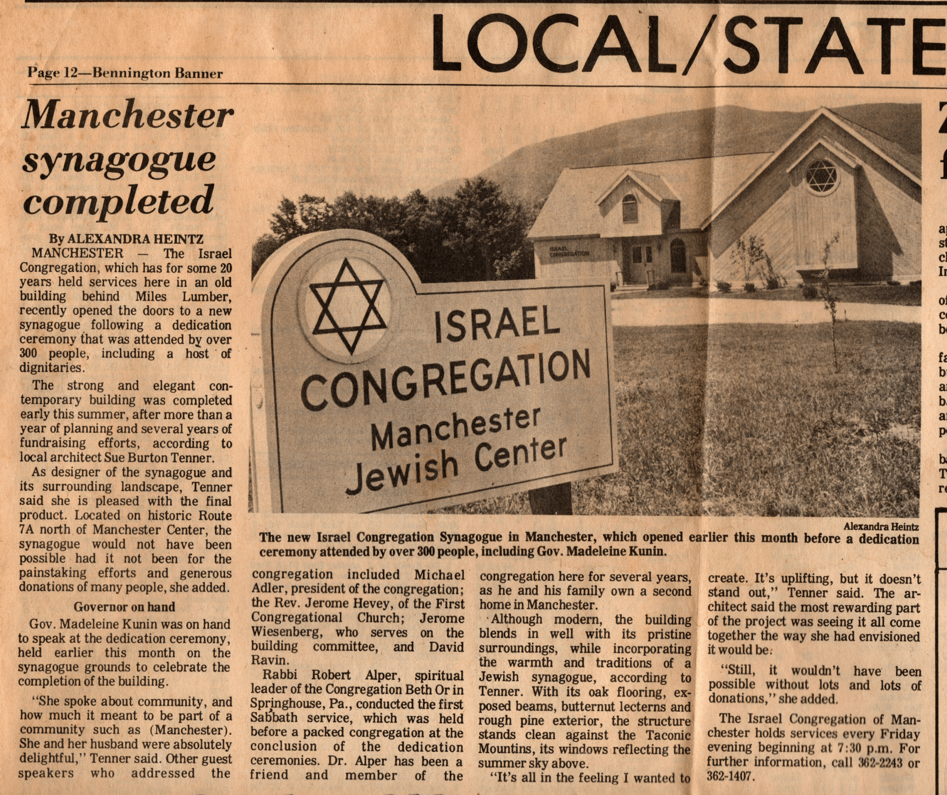 There were a few Jewish families in Manchester before 1918, but no communal recollections of any gatherings to conduct services in the town, even on the High Holy Days. In 1918 two men, Philip Cohen and Noah Kamenetsky studied the possibility of conducting services in town. These men were well versed in the teachings of the Torah and Talmud. Discussions and meetings were held around a pot- bellied stove in a little corner store in Manchester Depot. The Congregation was established in 1920. Services were held. Their sons, sons-in-law, and relatives made the minyan. Later on, other Jewish families moved into town assuring a male minyan.